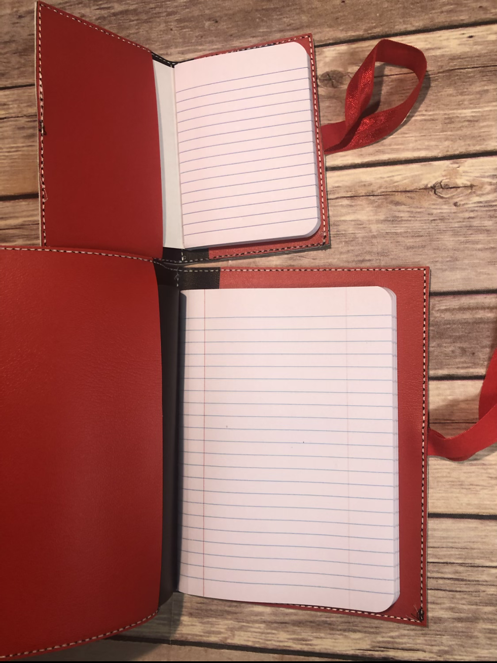 Each notebook keeper is made from a printed vinyl with an elastic band closure. The small size holds a 4.5"x3.25" notebook, and is $11 shipped. The large size holds a 5"x7" notebook and is $18 shipped. Notebooks are included with each one.